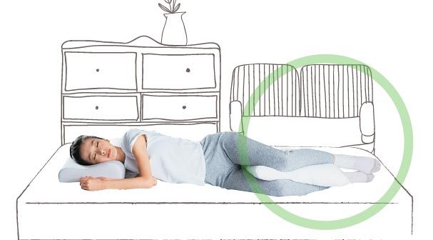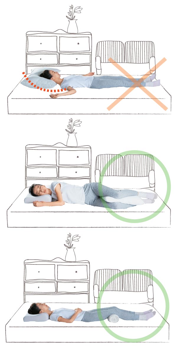 最理想的枕頭高度是平躺時,能讓頭頂、耳朵、肩膀呈一直線。想要降低腰部的負擔,也可以在膝蓋後面墊小枕頭或是毛巾卷。