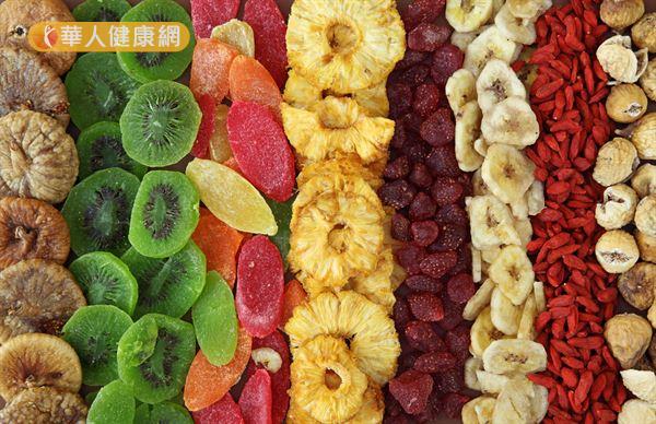 很多人都以為水果乾很健康,就肆無忌憚的狂吃下肚,殊不知水果乾其實熱量也不低!水果乾是新鮮水果經過脫水處理製成的,在加工過程中,許多營養素會被破壞,而且有些還會額外添加砂糖,熱量密度相當高,所以減肥最好不要吃這類的食物。舉例來說,100克的葡萄乾大約是338大卡,而100克新鮮葡萄的熱量卻只有64大卡,同樣重量的食物但所含的熱量相差了5倍左右。