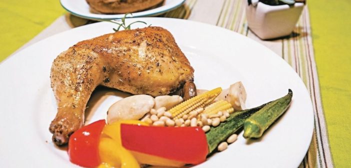 材料:雞腿2隻,松子1把,杏鮑菇、玉米筍、秋葵數根,紅黃甜椒各半個,馬鈴薯2個,鹽、橄欖油少許