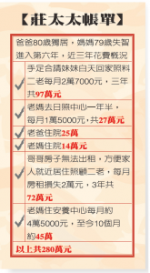 只算大筆開銷,近三年,照料家中二老,相關開支已達二八○萬元。金錢的帳還好算,但心力交瘁的帳、情緒重擔的帳和家人關係緊張的帳,要如何計數?