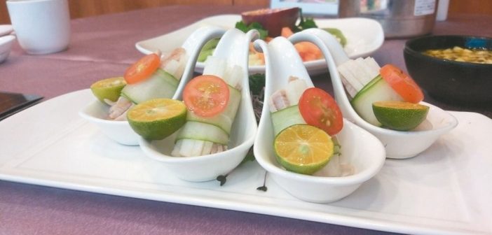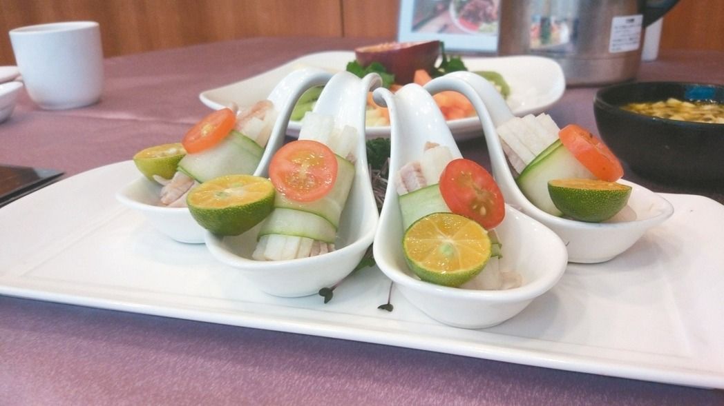 林玉樹推薦「繽紛鮮果」做為第一道菜色,他將水果切成細絲,淋上醬汁後甜而不膩,不僅開胃,也幫助消化,尤其是蘋果遇上香瓜,口感更是絕妙,冰過再食用口感更好。