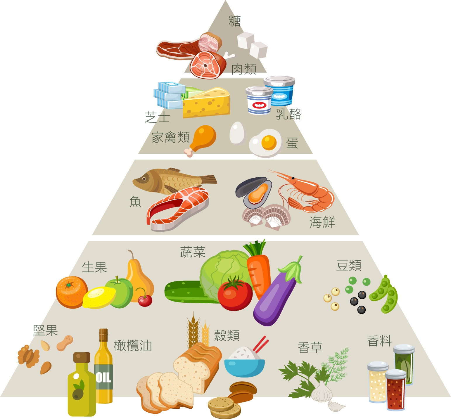 「地中海飲食」泛指希臘等位處地中海沿岸各國的飲食風格,雖然模式隨地域而有異,但總括來說,都是以蔬菜、水果、海鮮、天然五穀、豆類、果仁和橄欖油為主食;重點是嚐鮮,避免加工食品,以保持營養價值1(見附表)。